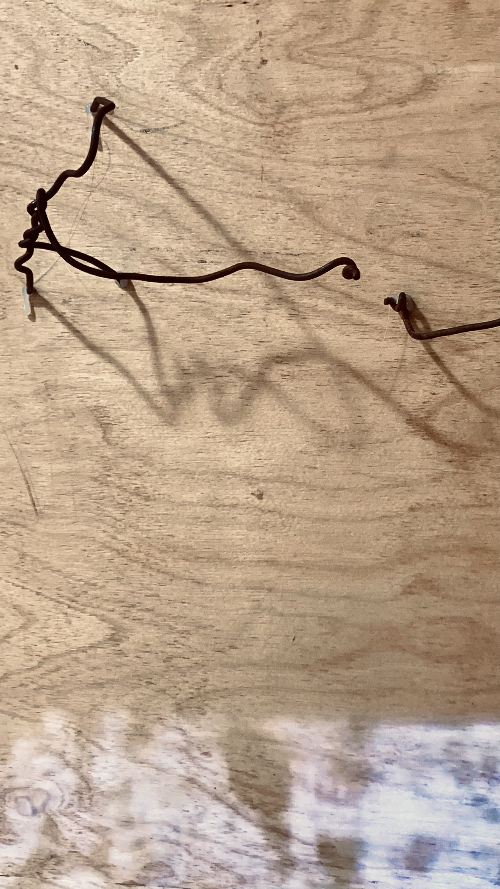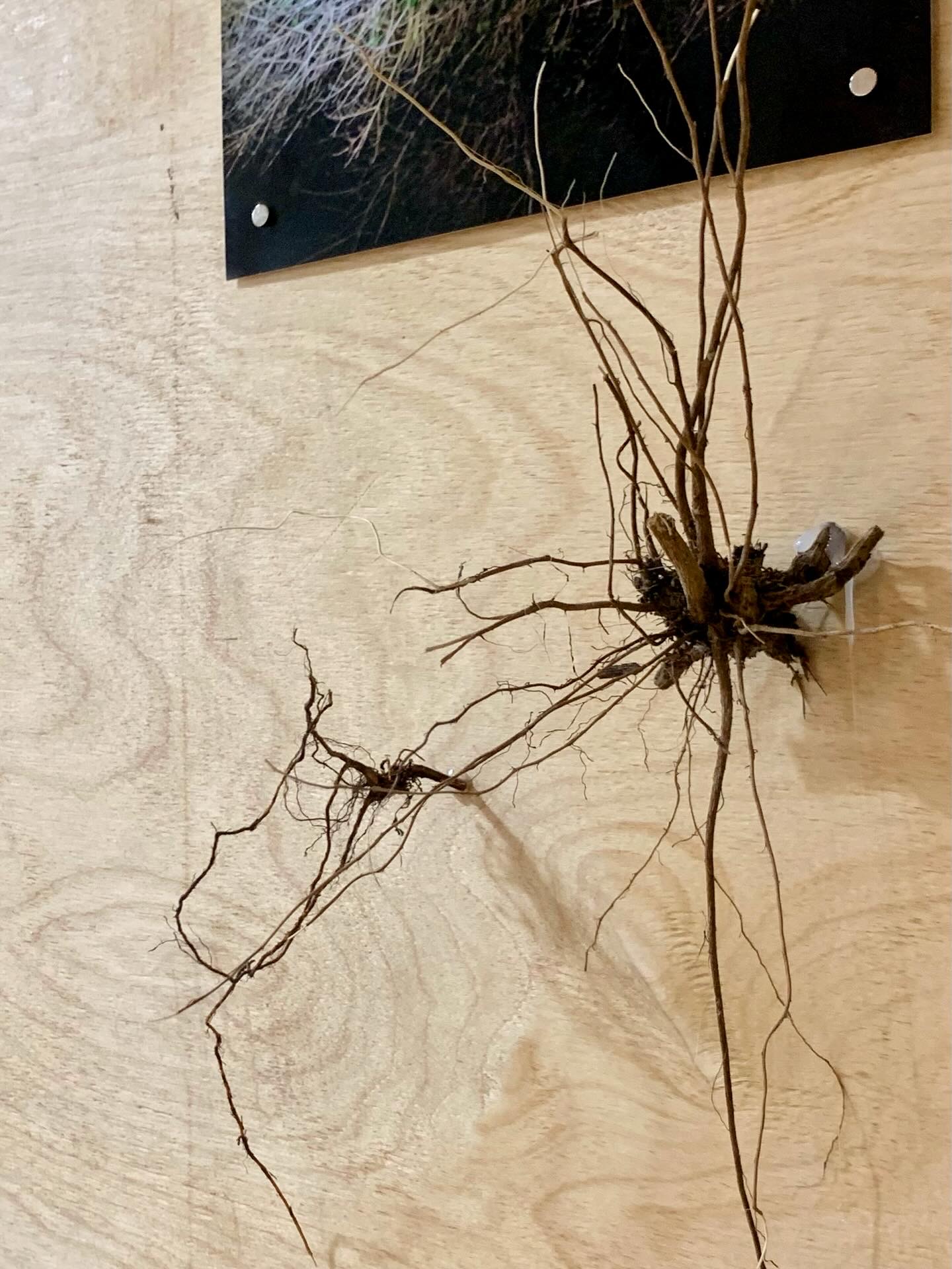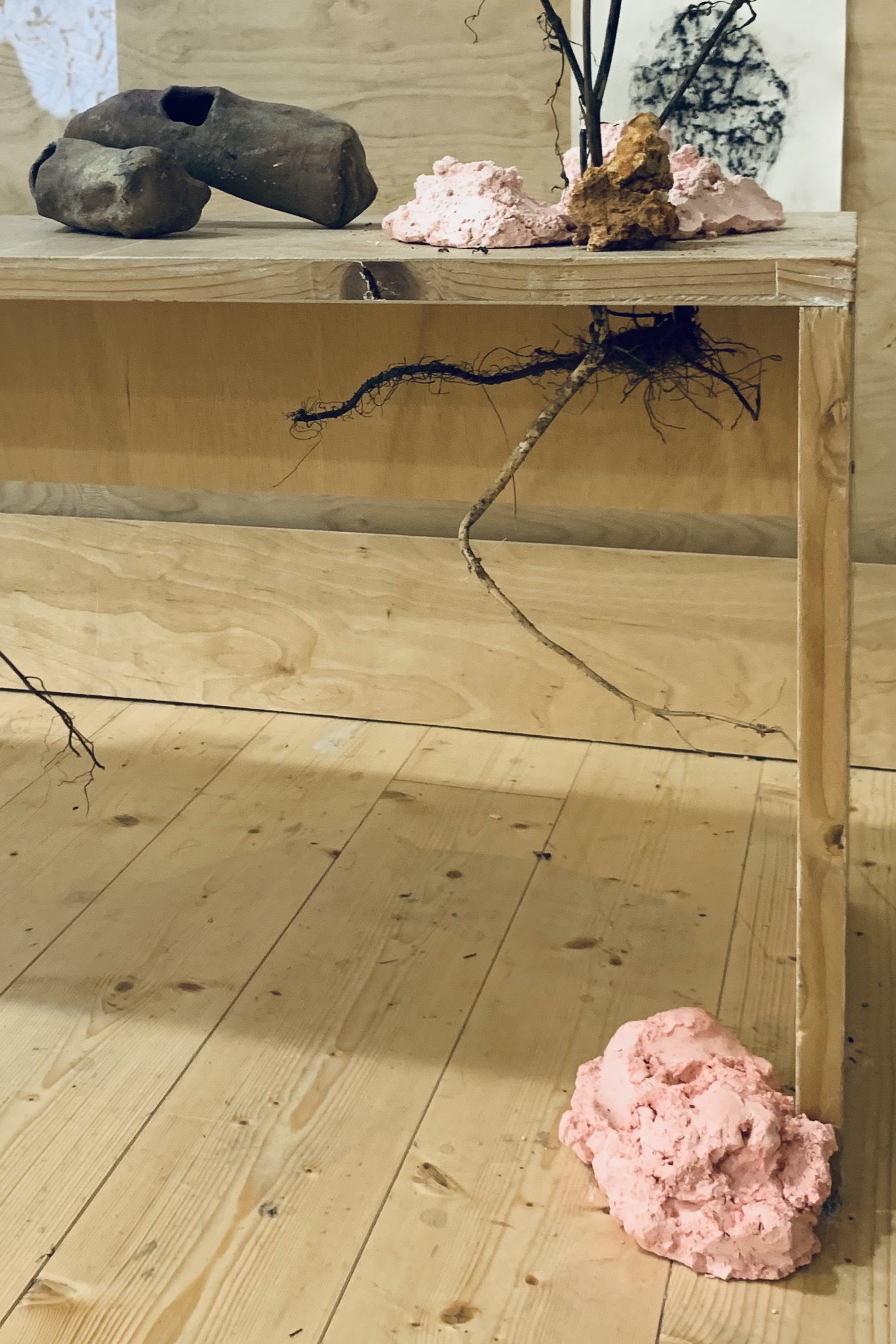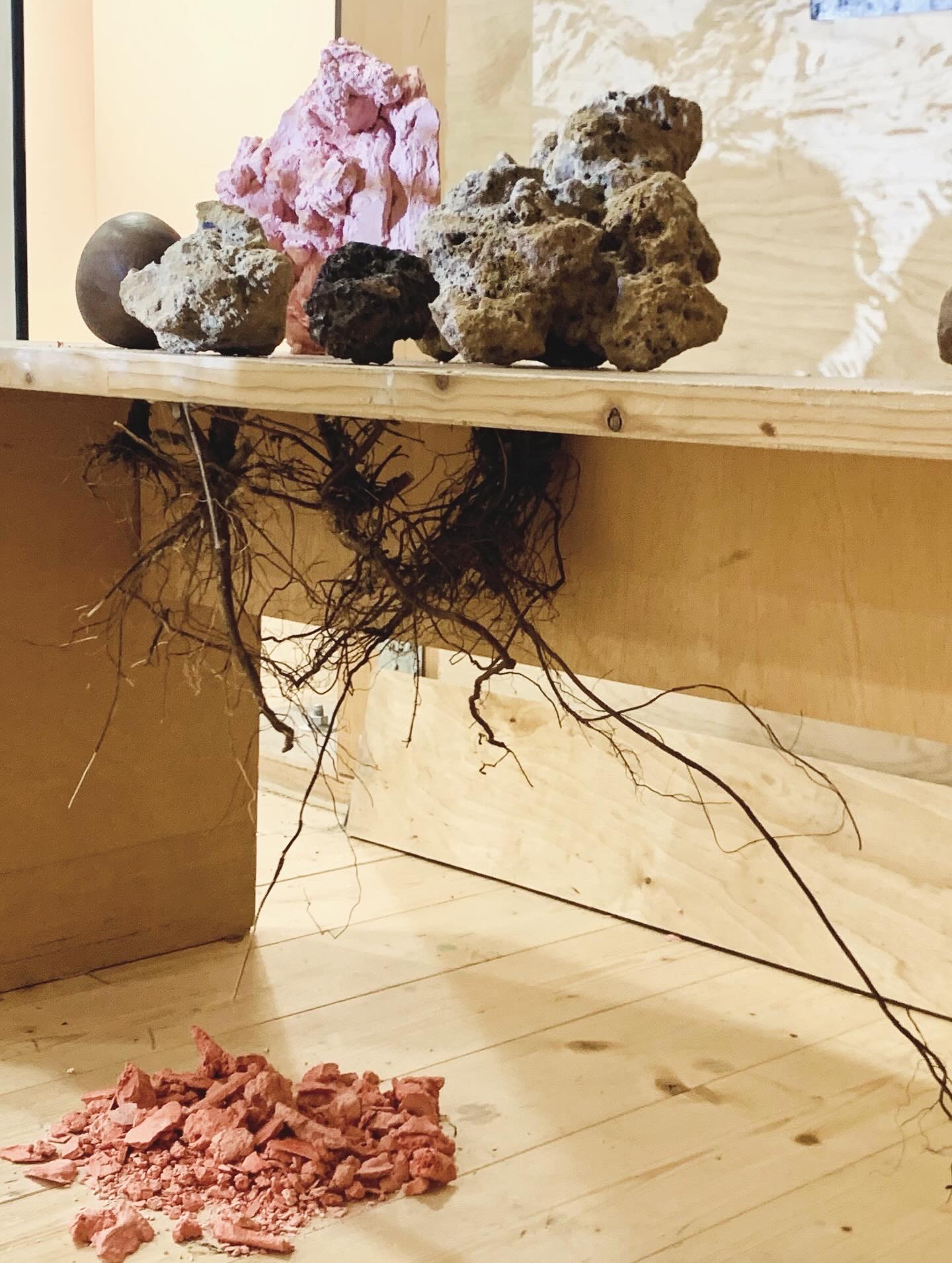 G.R.O.T.T.O. consists of a vertical wooden structure carrying prints and photographs, combined with objects and sculptural elements arranged on a wooden bench and the surrounding floor. The work incorporates found materials collected from nearby wastelands, natural minerals, and artificial rock formations made from colored plaster.