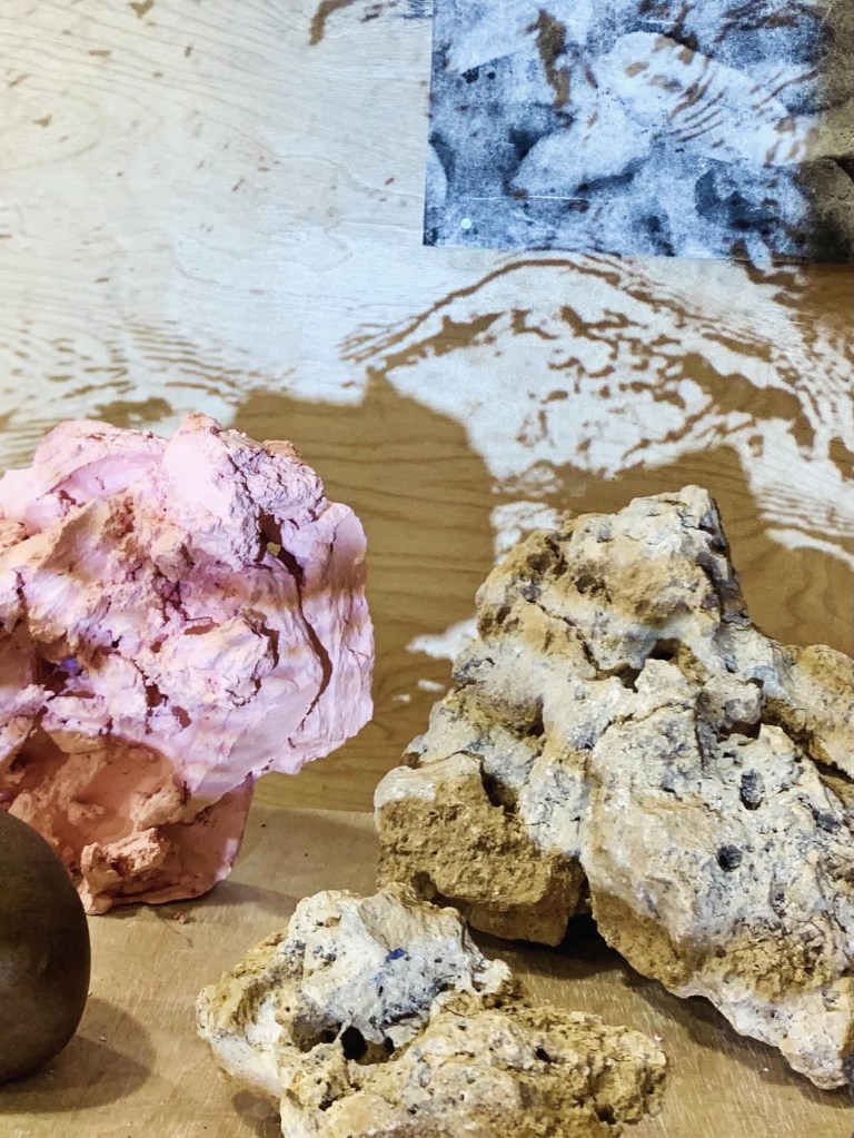 Installation with prints, photographs, found objects, plaster sculptures, minerals, sound, and video projection